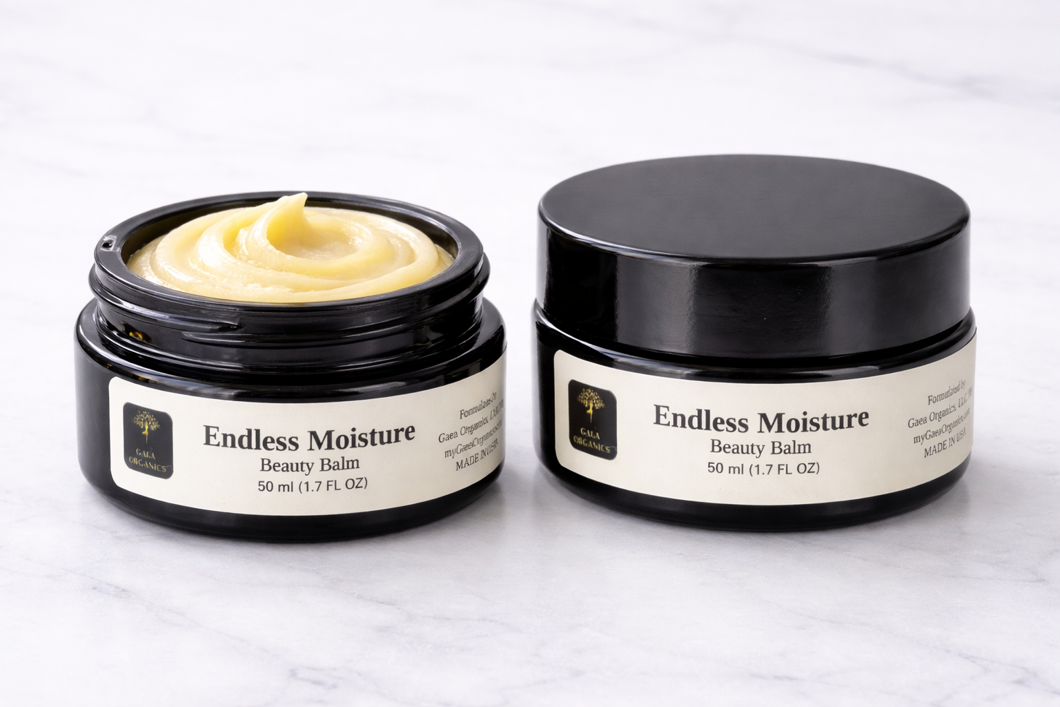 Endless Moisture is a concentrated, waterless beauty balm that transforms from oil to silky balm on contact. This vegan, wax-free formula is 100% active packed with organic botanical oils and plant butters that deliver deep hydration while protecting your skin's foundational barrier. Pure plant wisdom, endless nourishment.